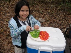 Put lid on dutch oven and transfer 15 briquettes to the top. Take family on a hike to wait for food to cook–sort of like Goldilocks and the 3 Bears.