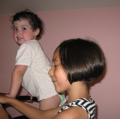 They look super cute! You did a good job, I was expecting an Emperor Kuzco haircut. And I agree, bangs were not a good idea. Foolish girls! Mom thinks that Julia looks just like Rosie now.