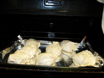 Spoon out 10 large dollops of meringue and push them with your finger onto the sheet, about 3/4″ apart.