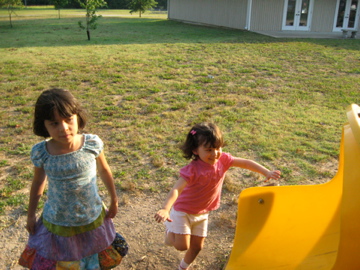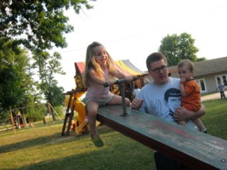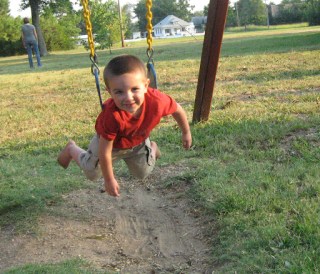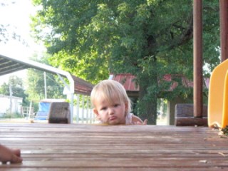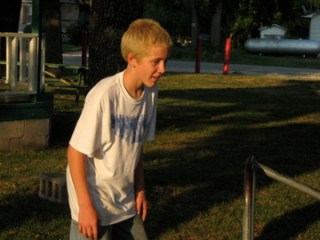 | Sam is getting ready to jump on a fast moving merry-go-round. No one else was brave/foolish enough to try it. |