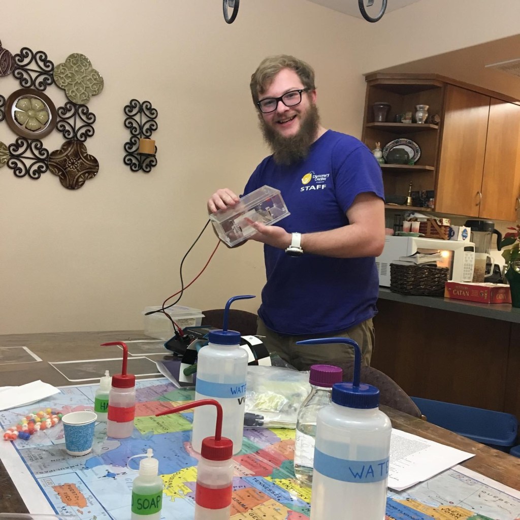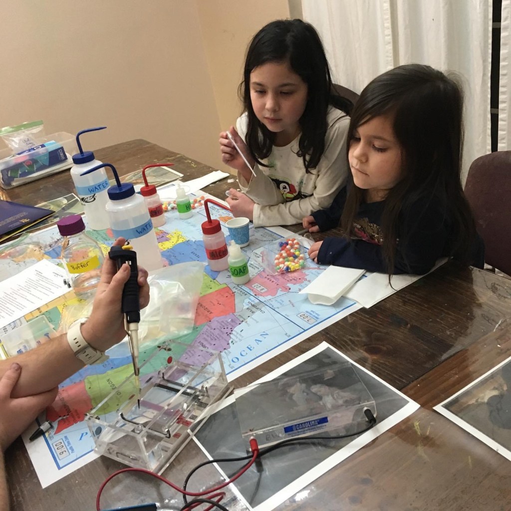 Our friendly neighborhood mad scientist doing a demonstration about electrophoresis. #bananacreampie is asking great questions. First graders sitting in on lessons meant for seventh graders is what homeschool is all about!