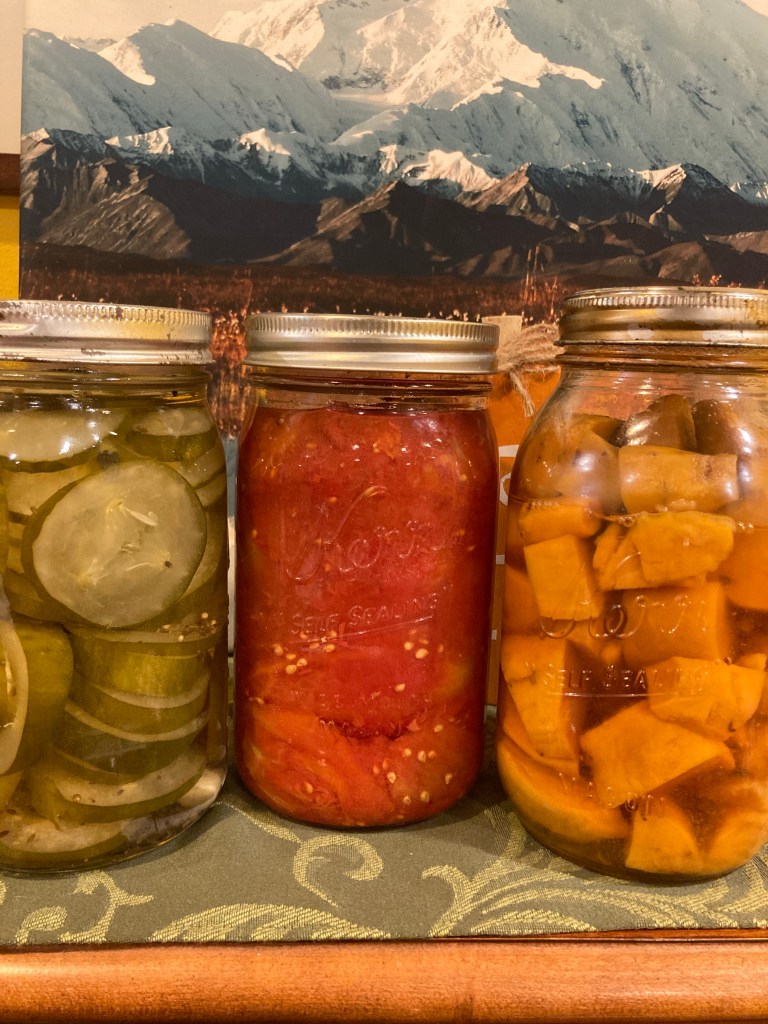 As I write, it is midnight, Saturday, and the girls and I have succeeded in removing the mountain of sweet potatoes from our dining table! I am waiting for the last batch of sweet potatoes to be done processing in the pressure canner. We have 21 quarts in glass jars. I wanted to can all the potatoes that way, but sweet potatoes take 90 minutes in the pressure canner (not counting the time to parboil, peel, and chop them and the time the canner takes to come up to pressure and cool down from pressure.) Also, the canner only holds 7 quarts at a time. So as I put the current 7 quarts in, and it was nearly midnight, I hollered “Uncle” and put the rest of the parboiled and peeled sweet potatoes in quart freezer bags. I have 13 quarts in freezer bags now in the deep freeze. Adding the sweet potatoes that looked like they would winter well in cardboard boxes in the garage, I bet we have close to 50 quarts of sweet potatoes. What a blessing.