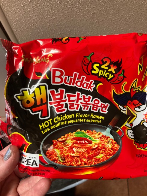 Blueberry Pie bought these very spicy ramen recently. They are super hot, even for us chili loving people. After morning chores, the big kids had a hot noodle eating contest. They only ate about 2/3 a package each, but they had fun.