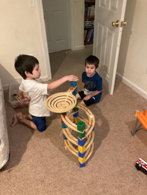 My big Mom Win for this week was on Tuesday. I had announced that “technology time” was over (as all the littles had been watching YouTube for at least 2 hours while I taught piano lessons) and was making dinner. The Scooter Pies came downstairs howling to play with Blueberry Pie’s Nintendo Switch. I said, “No,” but they continued to howl and repeat themselves. Have you ever had twins howling at you in stereo? I was about maxed out and ready to start yelling. But I stopped making dinner and sat down, taking one twin in each arm. My counselor says to get kids to calm down by having them take deep loud breaths,”dragon breaths.” I have never been able to get the twins to do this, but I tried again, doing the loud deep breaths myself, and saying, “It looks like you’ve turned into dragons. Better breathe out all that fire.” They didn’t do it, but they did stop howling, and I started calming down. Then I remembered how much we all like The Three Little Pigs, so I said maybe they were the big bad wolf, huffing and puffing. They started smiling, but still no breathing. I was really calmed down by now and realized that I could let them help with dinner. Here they are cutting up the summer sausage with butter knives for our Sausage and Cabbage over Rice. They were so excited to get to help. I read somewhere that when a child asks for technology, what they are asking for is connection.