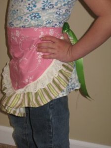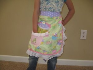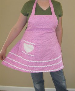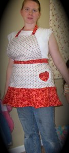 I actually recieved this apron over a month ago…before Valentine’s Day. However, there was no one to take a picture of me in it, since my DH was gone. He’s home now π and I got him to take a picture of me. I L-O-V-E this apron. It turned out that my cousin was my partner and made it for me. I need this pattern. It looks better on me than any of the other aprons that I own. (And I have a plethora.) This apron is made for my shape.