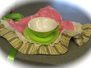 I cannot impress upon you enough how much I love this apron and feel so pretty in it. The ties are wide enough to make a fat bow. It is just great. She also included some pink hot pads and a marvelous fridge magnet that looks like a chocolate covered strawberry. So tasty looking. There was also a little apron for my dish soap bottle and several other goodies. I am too lazy to take a picture of right now.