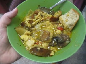 Then I added all the turkey bits and veggies and enough water to make it all soupy. I had to add a bunch of salt–like 1 1/2 Tbs. Then I let it simmer for an hour until the curry flavor got into the veggies.