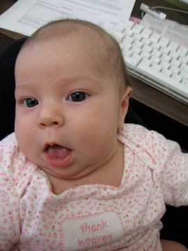 Baby Dumpling can say lots of words, which is also unusual for such a little baby. She says Mama, Dad, pig, dog, kitty, and cracker (but she means any food).
