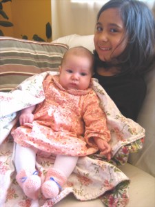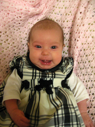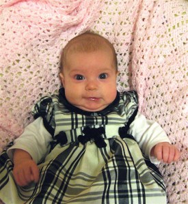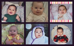 I don’t know how you feel about your kids, but mine all seem to look quite a bit alike–they are born and I think, “well, it’s mine alright. Cookie Cutter kids.” But as they grow, they remind me of first one and then another sibling. So I went to the scrapbook and pulled out a 4 month old picture of each of my babies to compare.