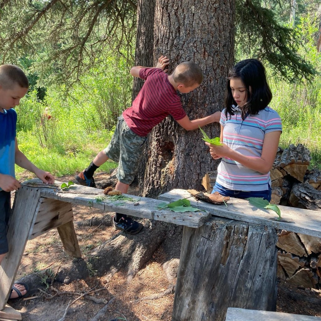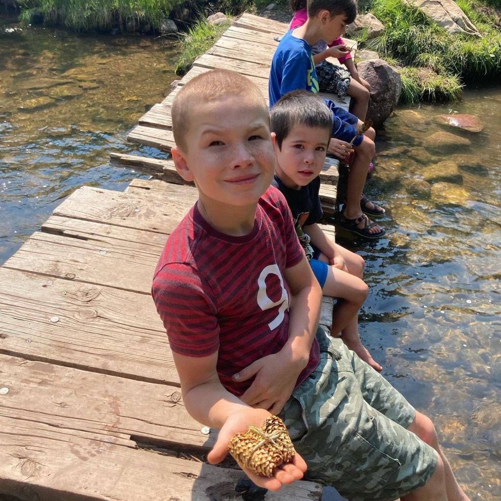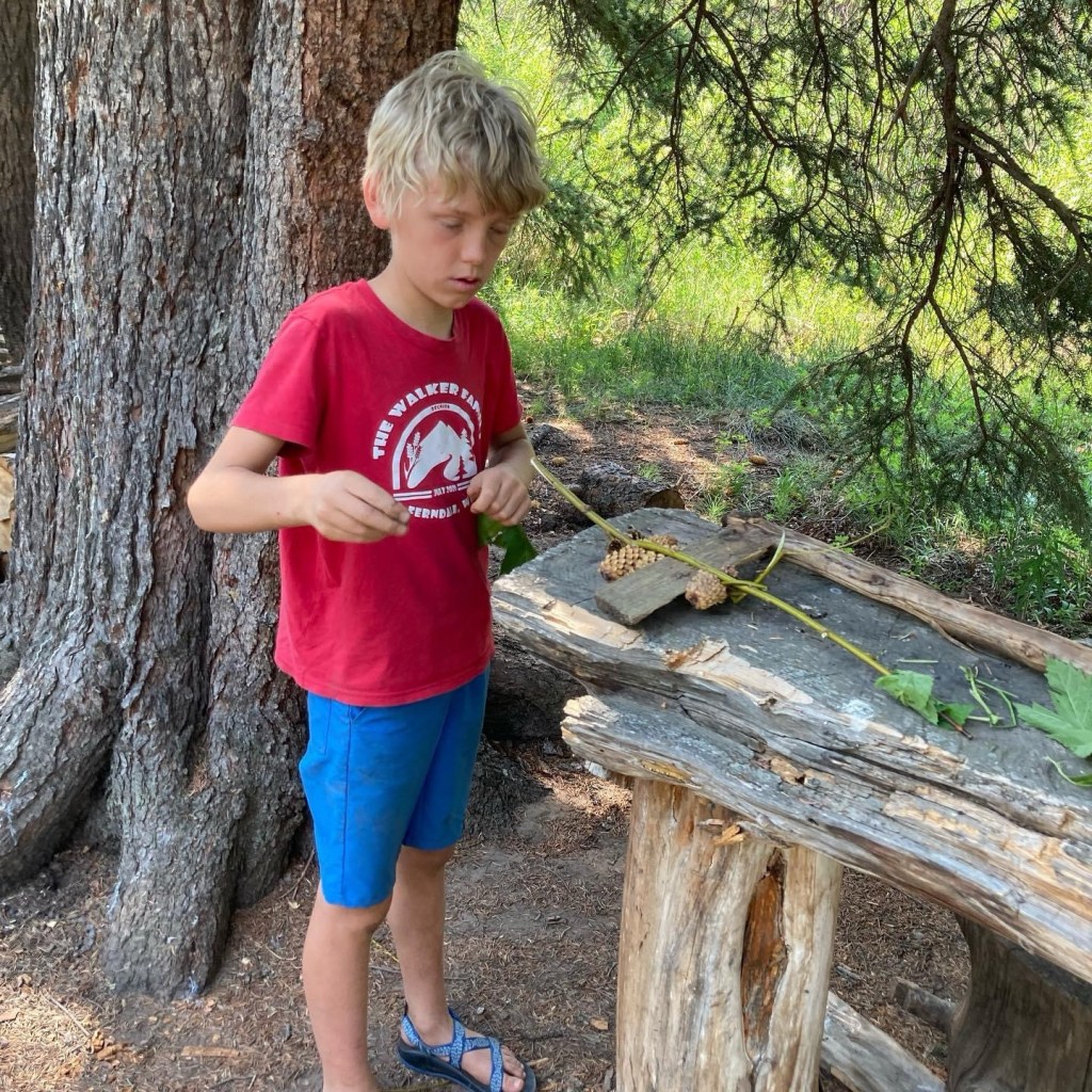 Making boats to race on the Weber river. Ingredients: pine cones, willow branches, pine gum, leaves, ingenuity