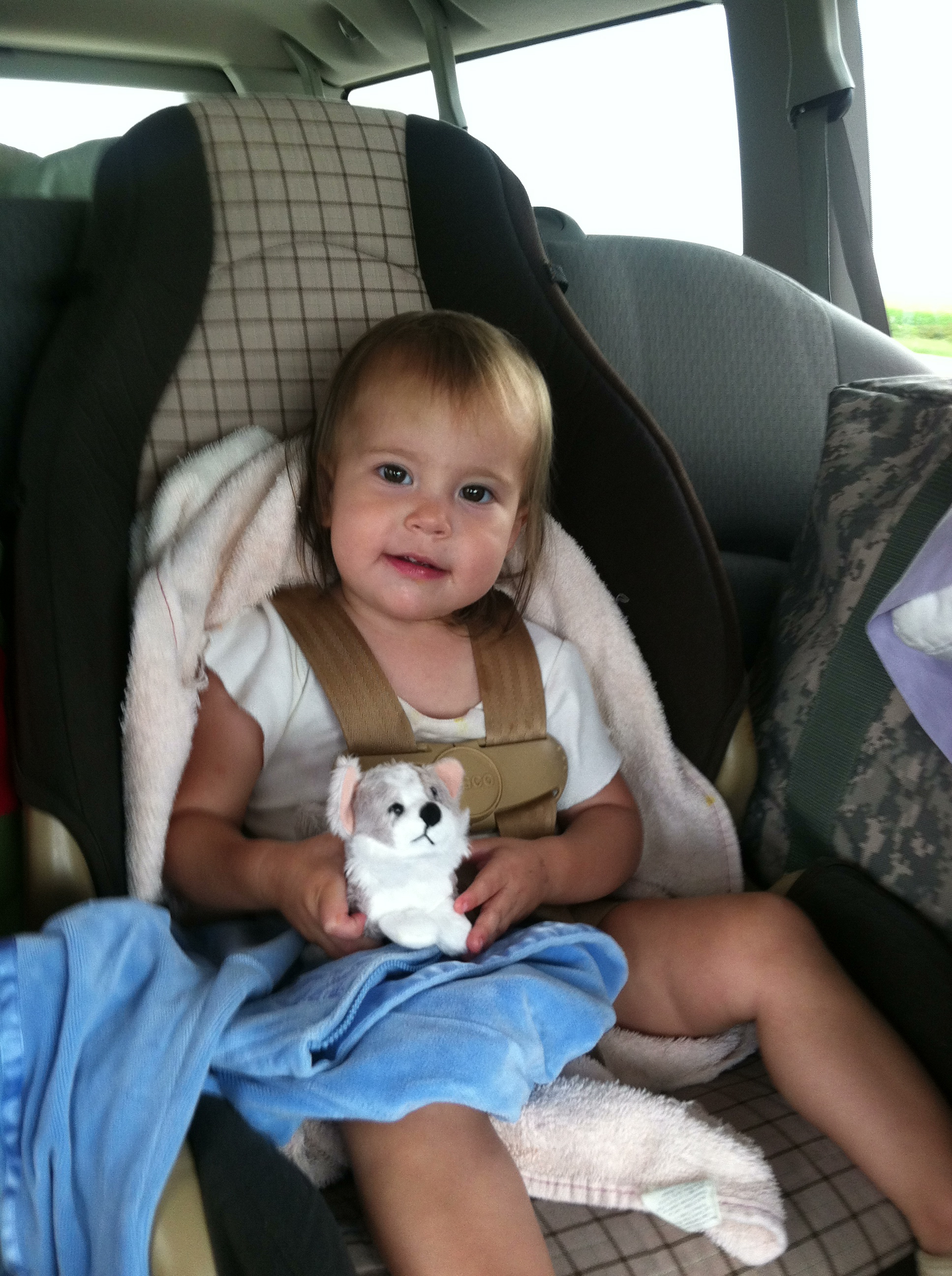 We drove straight from home to our first campsite at Tettegouche State Park, about an hour north of Duluth, Minnesota. That was a 14 hour drive and Baby Dumpling was not happy for a large part of it. I don’t know if she had a stomach bug or was just car sick, but we had to stop 3 times so I could clean her and her car seat and rid the car of vomit smelling things. Then she just got tired of being in her car seat and got downright fussy. Having a crying baby makes everyone in the car tense and cranky, especially DH & I. We finally stopped around the Iowa-Minnesota border, and I broke the Sabbath to buy her this barking doggy toy to hopefully help her be happy. She was happy for about 30 minutes. Beginning a road trip on a Sunday was not the best idea we’ve ever had.