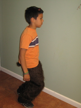 I found this marvelous goaty fake fur at Jo-Anns and used a Pajama pants pattern to make the goat legs, complete with tail and hooves.