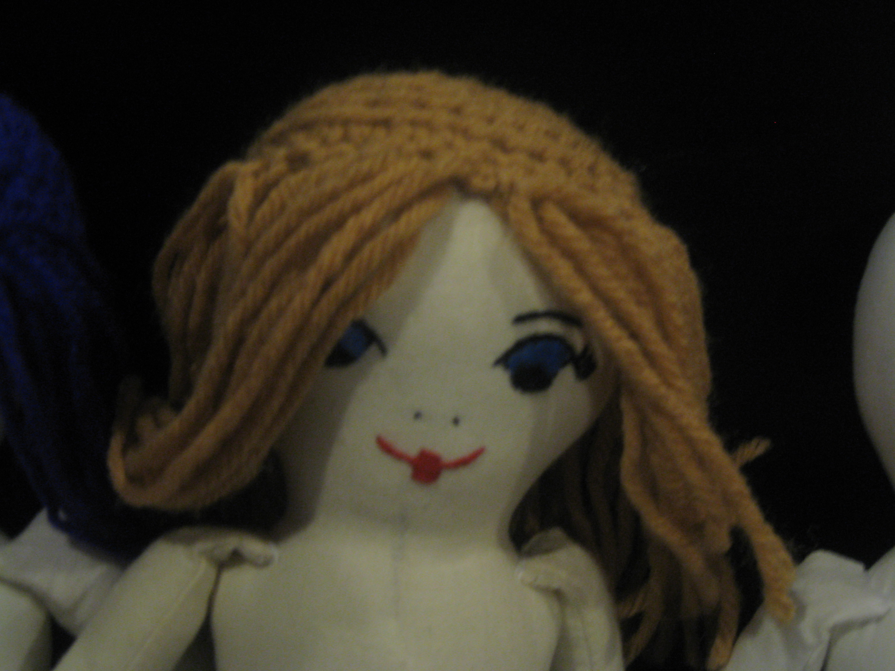 I crocheted little caps for the dolls which we tied fringe all the way around to make their hair. I sewed the wigs to the doll’s heads with invisible thread.