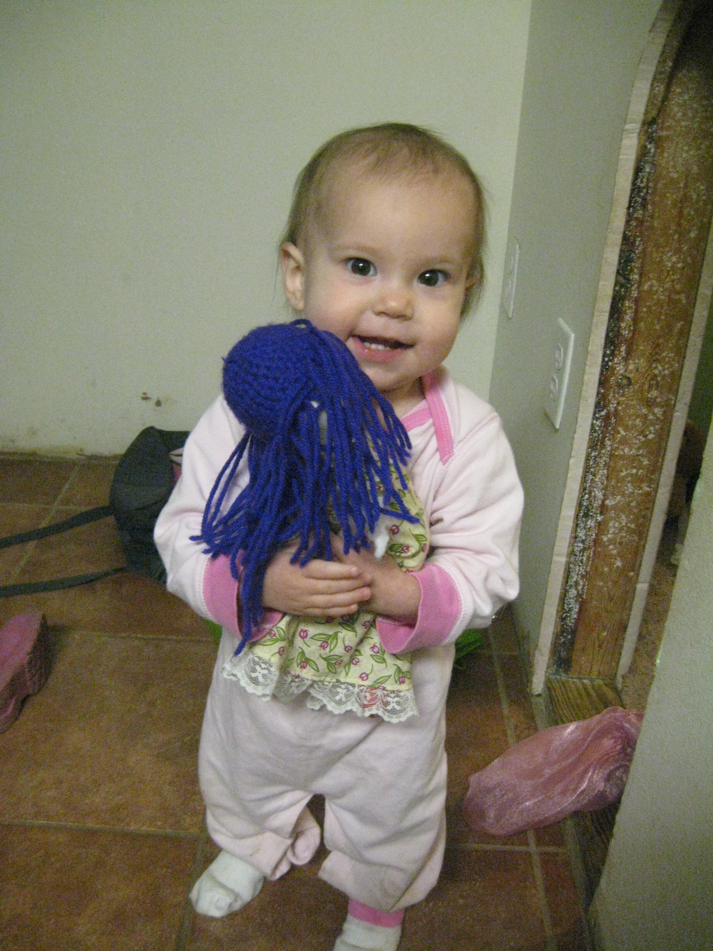 I actually have pieces for 4 more dolls cut out, but not the heart to make them up yet. You can find the pattern free over at Make it and Love It, but I can’t guarantee you child will love it. I sure think it’s a cute pattern. The only alteration I made from the instructions was to make the doll hair out of flannel instead of felt for durability.