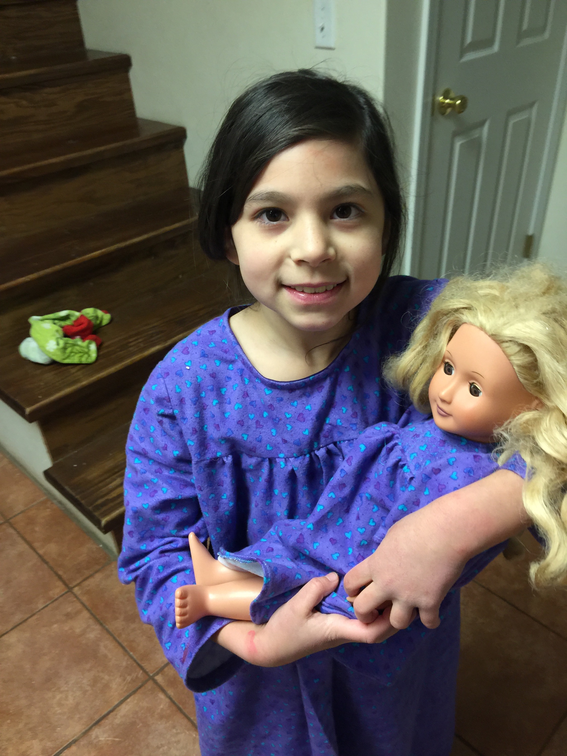 Well the dream of these two girls hearts has been to have matching pajamas with their dolls. I saved the scraps from cutting out their nightgowns and Voila! Today their wildest dreams came true!!