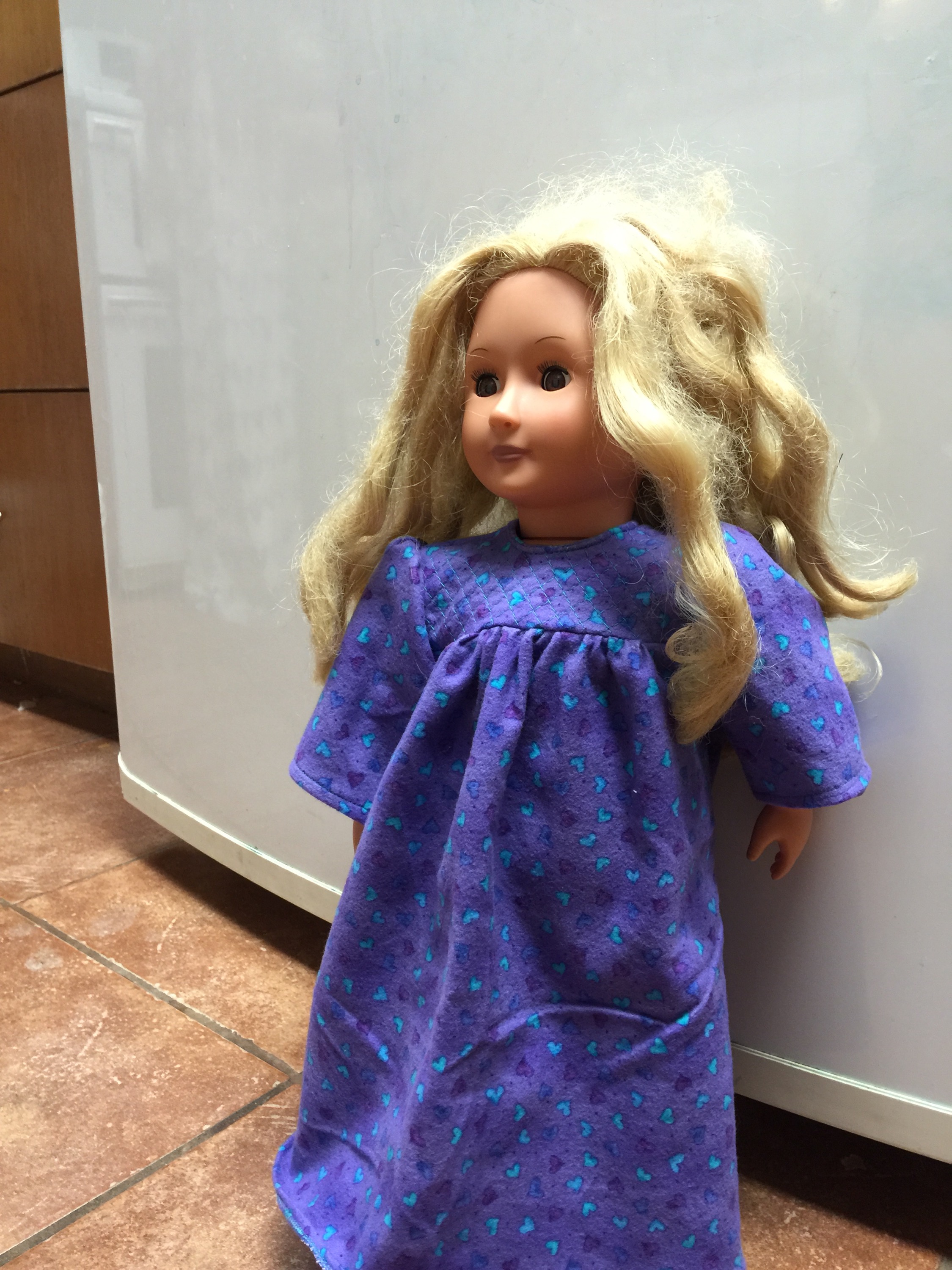 If you look closely, you can see that I quilted the yoke on this nightgown. I used the AG pattern for Kristen’s nightgown, which you can download here. I just left the cuffs off the sleeves and turned the neck piece under so the nightgown would be the same as Peach Pie’s.