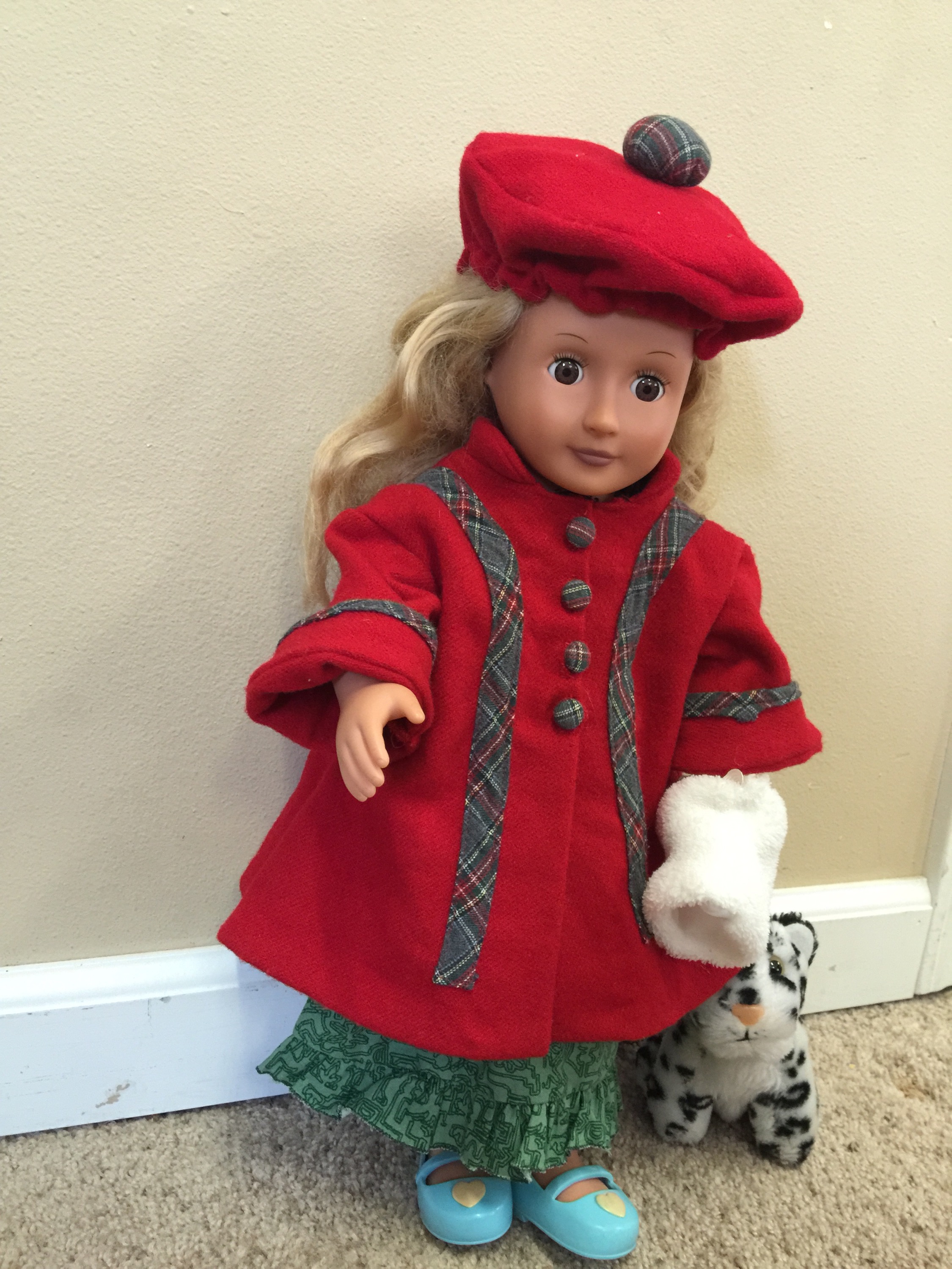 I didn’t have another thrifted wool piece to make PumpkinPie’s doll coat, so hers is made from fleece. It worked well enough and is pretty, but it isn’t luminous the way the wool is. Yes, I made the tam-o-shanter and muff, too.