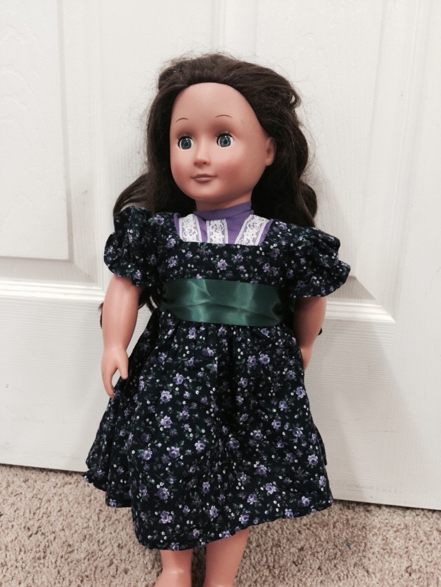 This dress does not correspond to any of PumpkinPie’s wardrobe. It is just purple, which was her favorite color for a long time. Also, the flowers were a good scale for a doll dress. The coats and this purple dress came from Addy’s Pretty Clothes patterns. The tam and muff are Samantha’s. In my opinion, Addy and Josephine have the prettiest dresses.