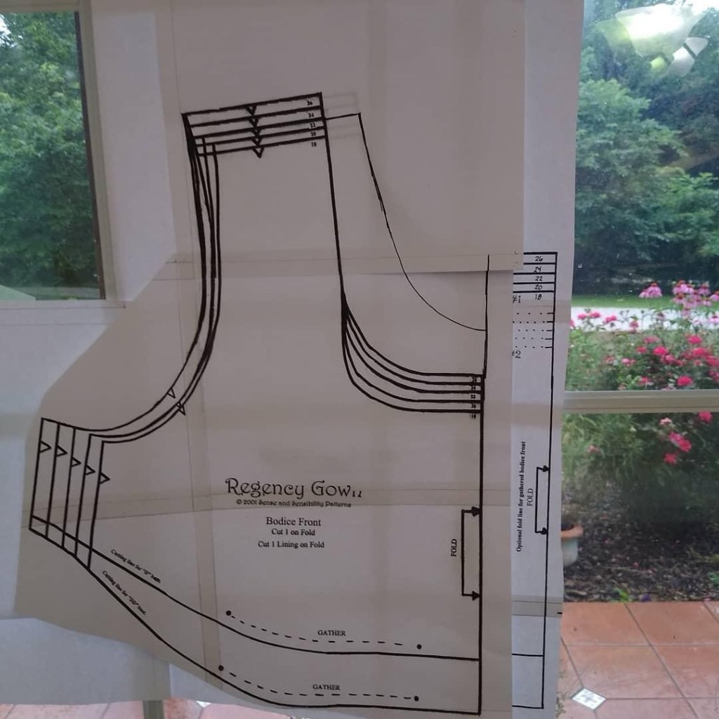 This morning I woke up knowing what to do (after thinking about those fitting blog posts all day.) The important thing is that the waist be exactly at the underbust line and no lower/higher, so that’s what I need to make sure of. My helper pinned the back of the bodice closed for me, and I was able to determine that it was an inch too long, which I have trimmed. I did that by marking my underbust line right on the fabric with a sharpie, and then comparing it to the pattern and adding 5/8ths of an inch for seam allowance.