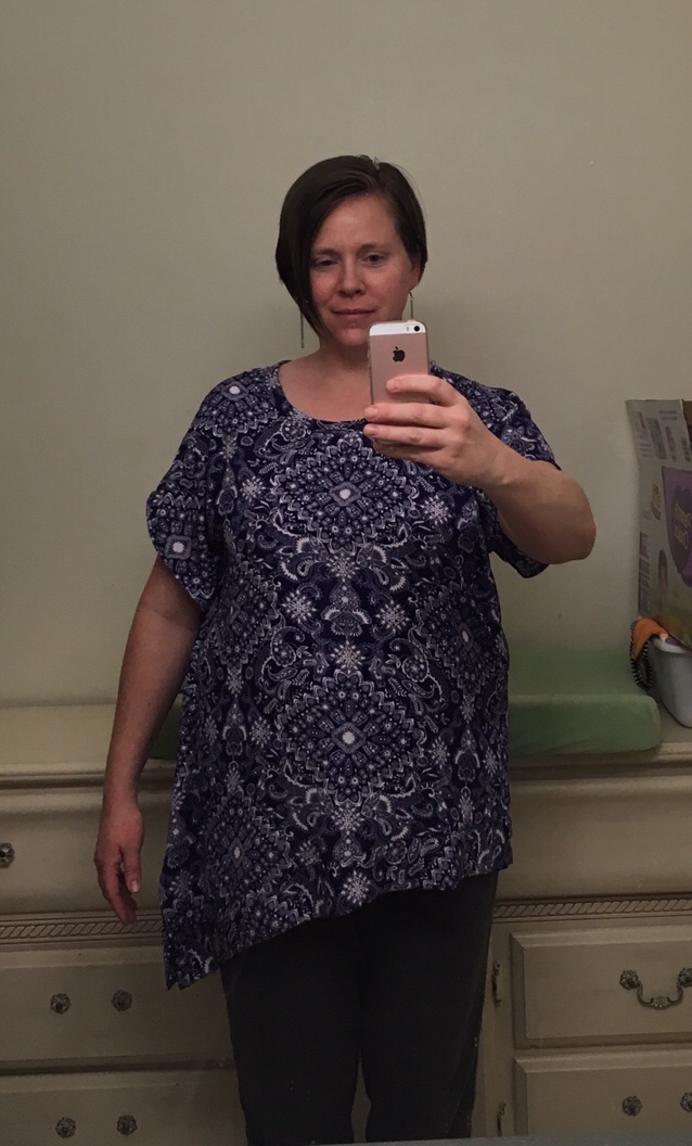 This was my beta test or my “muslin”. I used an old piece of fabric that has been acting as a tablecloth for several years and was ready to be retired. After measuring myself and the pattern, I cut a size 12 neck and shoulders, graded it out to a 14 on the sides and put a size 18 sleeve in.