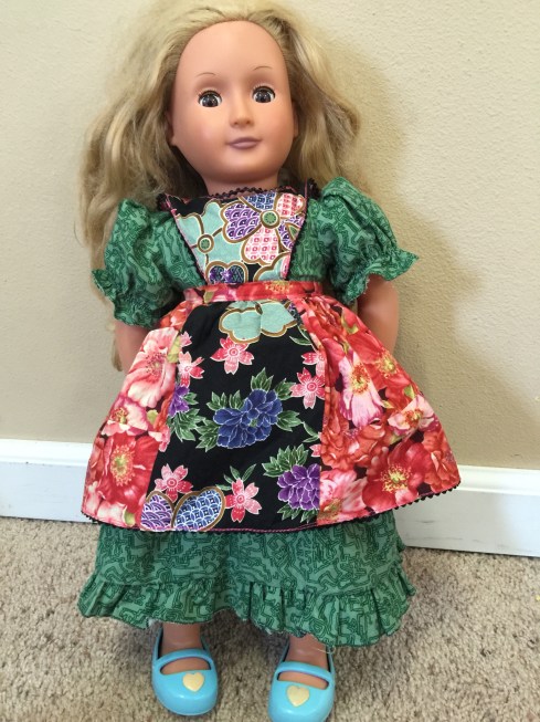 Sewing doll clothes is so much more fun now than it was when I was a girl, because the clothes look good and fit the doll when I am done!! This apron dress was made from scraps left over from a dress I made Peach Pie. It isn’t as close a match in style as the nightgown, but it’s not too bad. That tiny ric rac around the apron was murderous to sew.