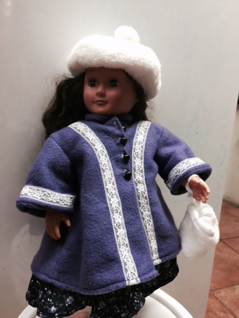 I didn’t have another thrifted wool piece to make PumpkinPie’s doll coat, so hers is made from fleece. It worked well enough and is pretty, but it isn’t luminous the way the wool is. Yes, I made the tam-o-shanter and muff, too.