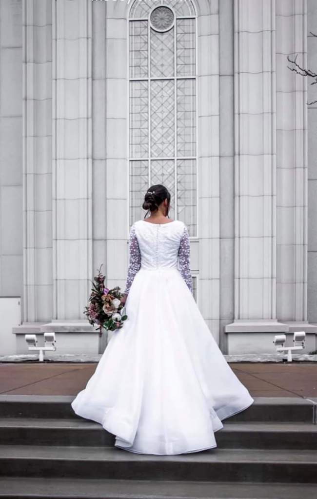 I hand sewed almost 30 pearl buttons done the back of the dress. This took 3 hours alone, but they were beautiful.