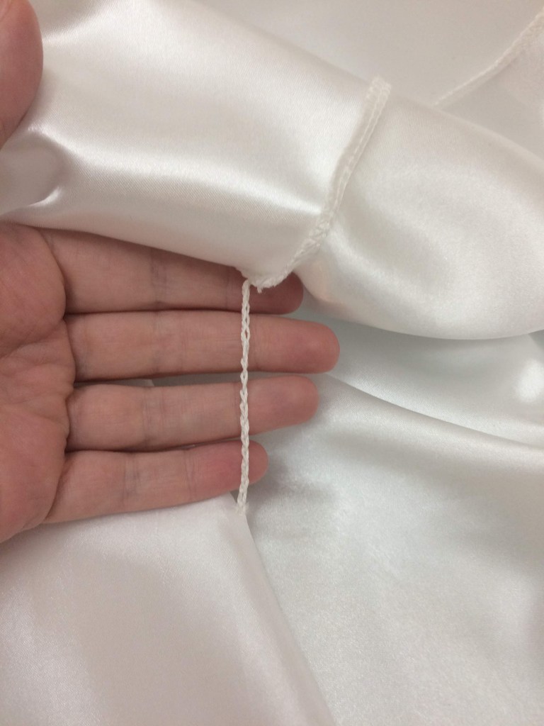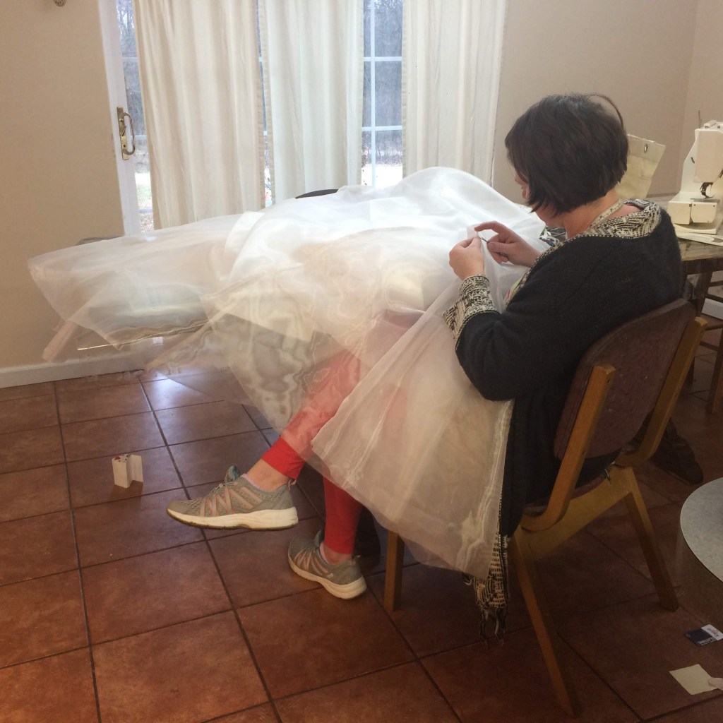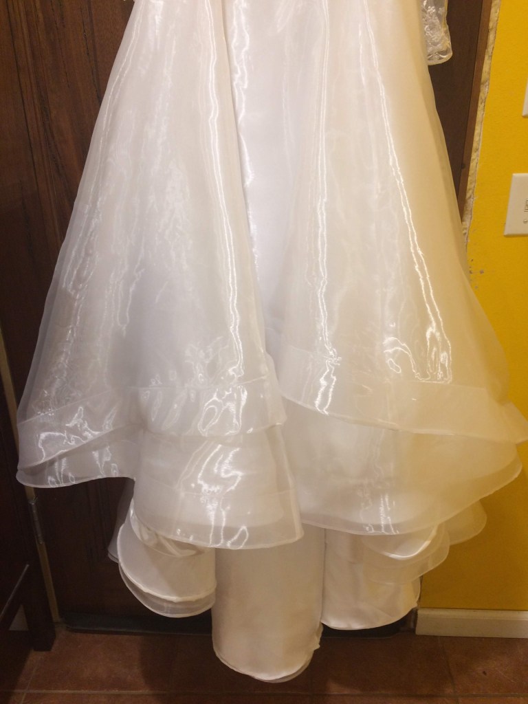 This dress had four layers of skirts: one lining layer, one satin layer and 2 silk organza layers. I borrowed my mother-in-law’s serger to do the satin and lining layers, but put French seams in the organza layers with my regular machine. I debated this extra trouble for a dress that would only be worn once or twice, but in the end I did it, and I was glad—just the movement of the dress as I sewed it would have been enough to fray some of the seams otherwise.