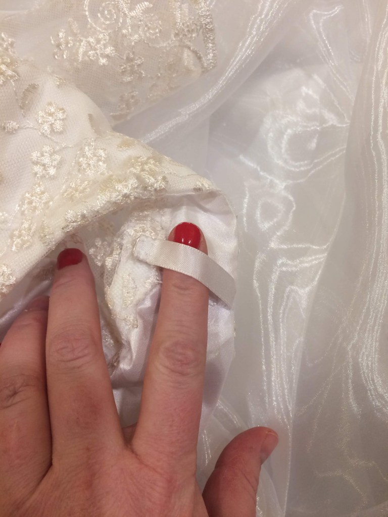 I put loops of ribbon to hang the dress on the hanger so that the weight of it wouldn’t pull the shoulders out of shape.