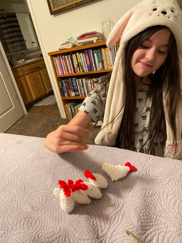 Apple Pie is not to be left out of yarn crafts and is crocheting a Jelly fish hat for her planned Halloween costume.
