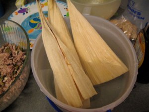 2. Take the corn husks and put them in a bowl of warm water to soak and get soft.