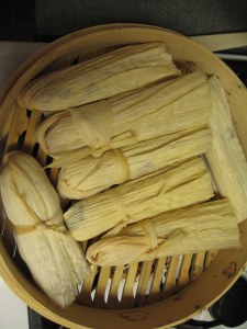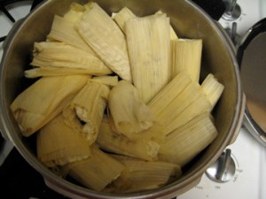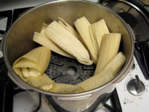 If you have a pressure cooker with a steam plate, it only takes 10 minutes to steam the tamales, once you have brought them up to pressure. This is how Abuelita taught me to cook them. She placed a clean empty tuna fish can in the bottom of her pressure cooker and set the steam plate on top of it. She filled the can and the space around the can under the steam plate with water. (I use this same method to steam corn on the cob).