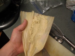 6. Take a corn husk and spread a couple of heaping spoonfulls of masa on it.