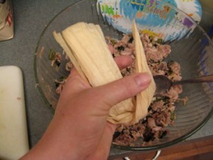 I was really bored with cooking last month. So one day I decided to make something less ordinary: tamales. I learned how from 2 ladies. One, my dear husband’s Abuelita, who I visited in Mexico. Two, my mother, who learned from her Mexican neighbor. My goodness! Tamales are tasty–there’s a reason they are traditionally served at Christmas time in Mexico. Yum Yum, food you’ll dream about for days after. Tamales are time consuming to make, and your feet will really hurt by the end– so your best option would be to bring me gifts and beg me to make them for you. If, however, you don’t like kissing up, here is what to do: