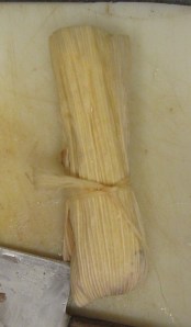 8. Roll up the corn husk and twist and flip the bottom–like you do with a bread bag when you are too lazy to get a twisty tie for it.