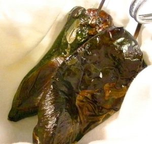 1. Turn the broiler in your oven on high. Take the Poblano Chiles and place them about 6-8″ from the top of the oven. Sometimes I put them on a cookie sheet and sometimes I just set them right in on the oven rack. After about 3 minutes, check the chiles. When their skin is pretty uniformly blistered on top, grab them by their stem and flip them over to blister the other side (3 more minutes).